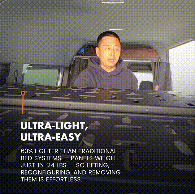 Our platform Bed System cuts weight by up to 60% compared to traditional steel systems, with each panel weighing just 16 to 24 pounds — easy to lift, remove, and reconfigure on the go.