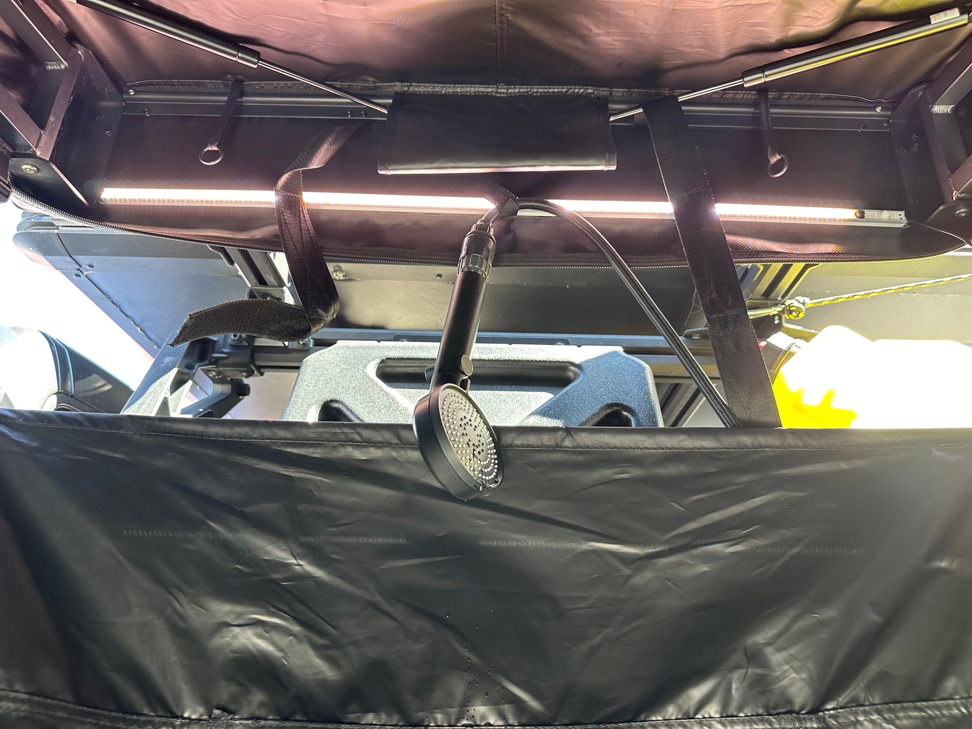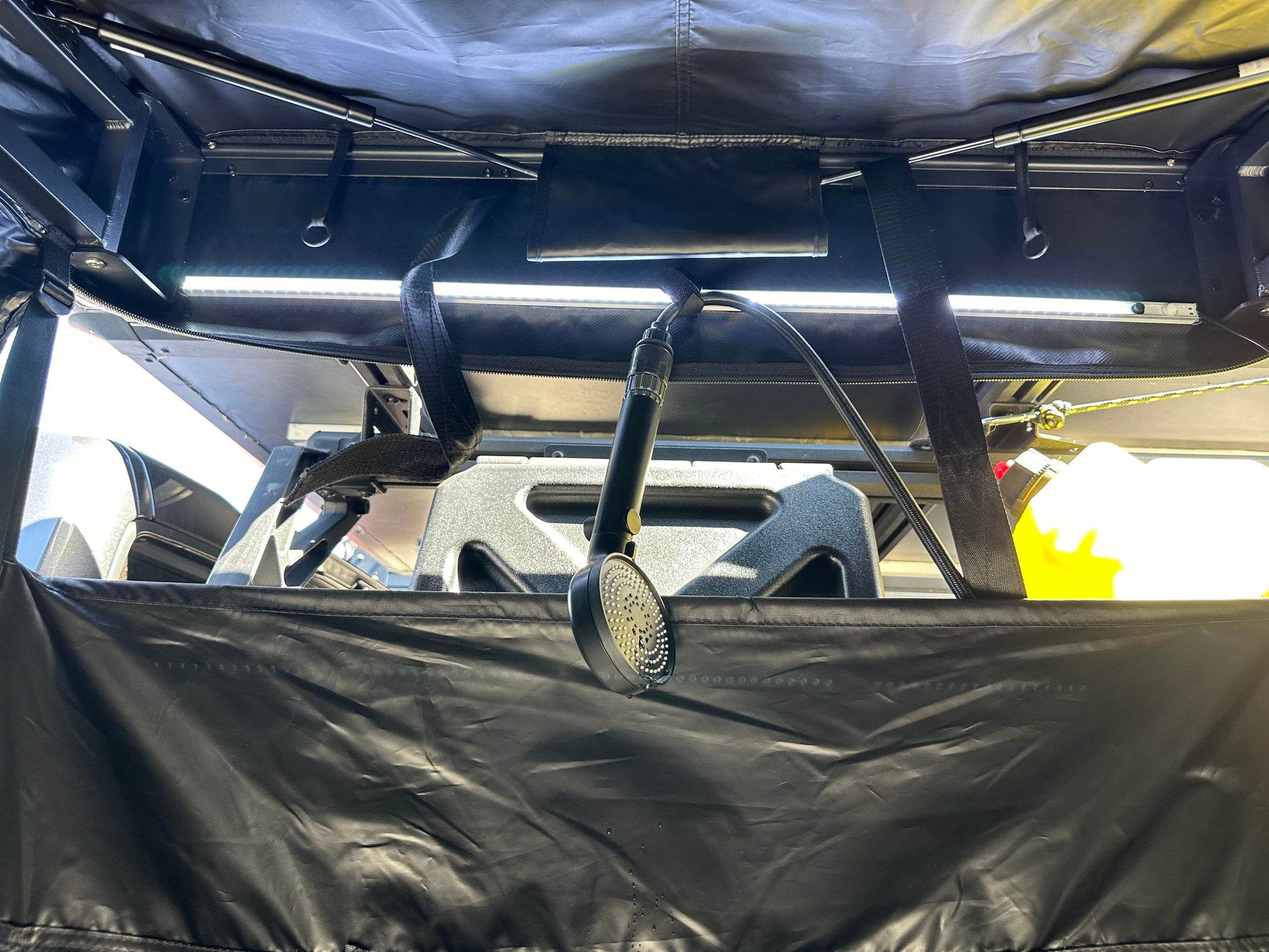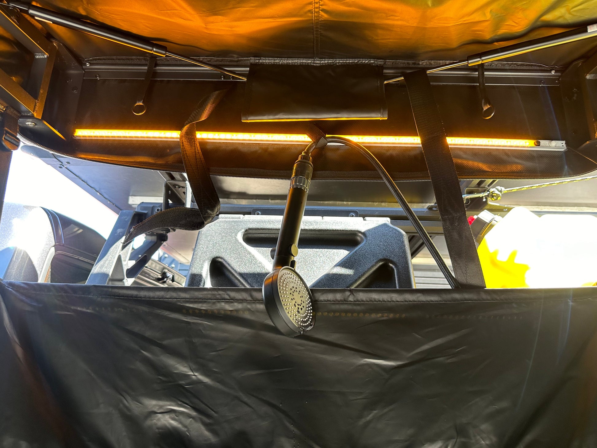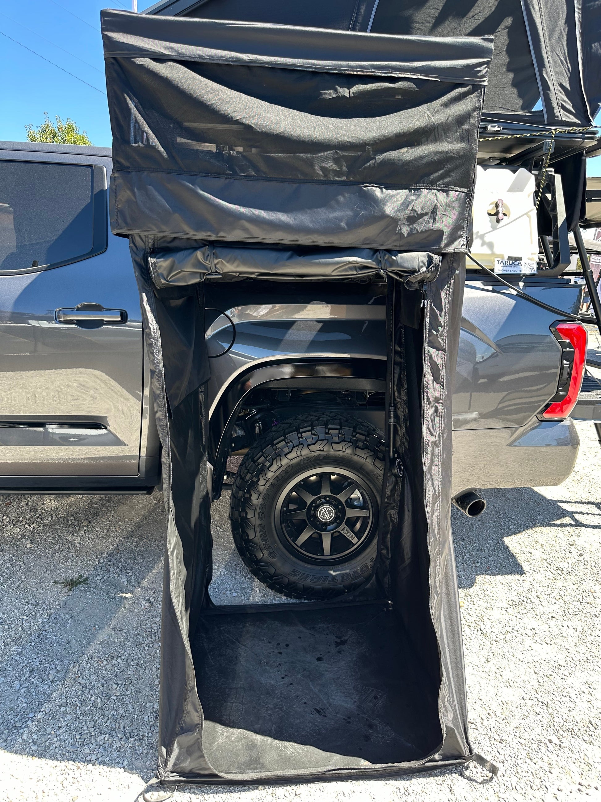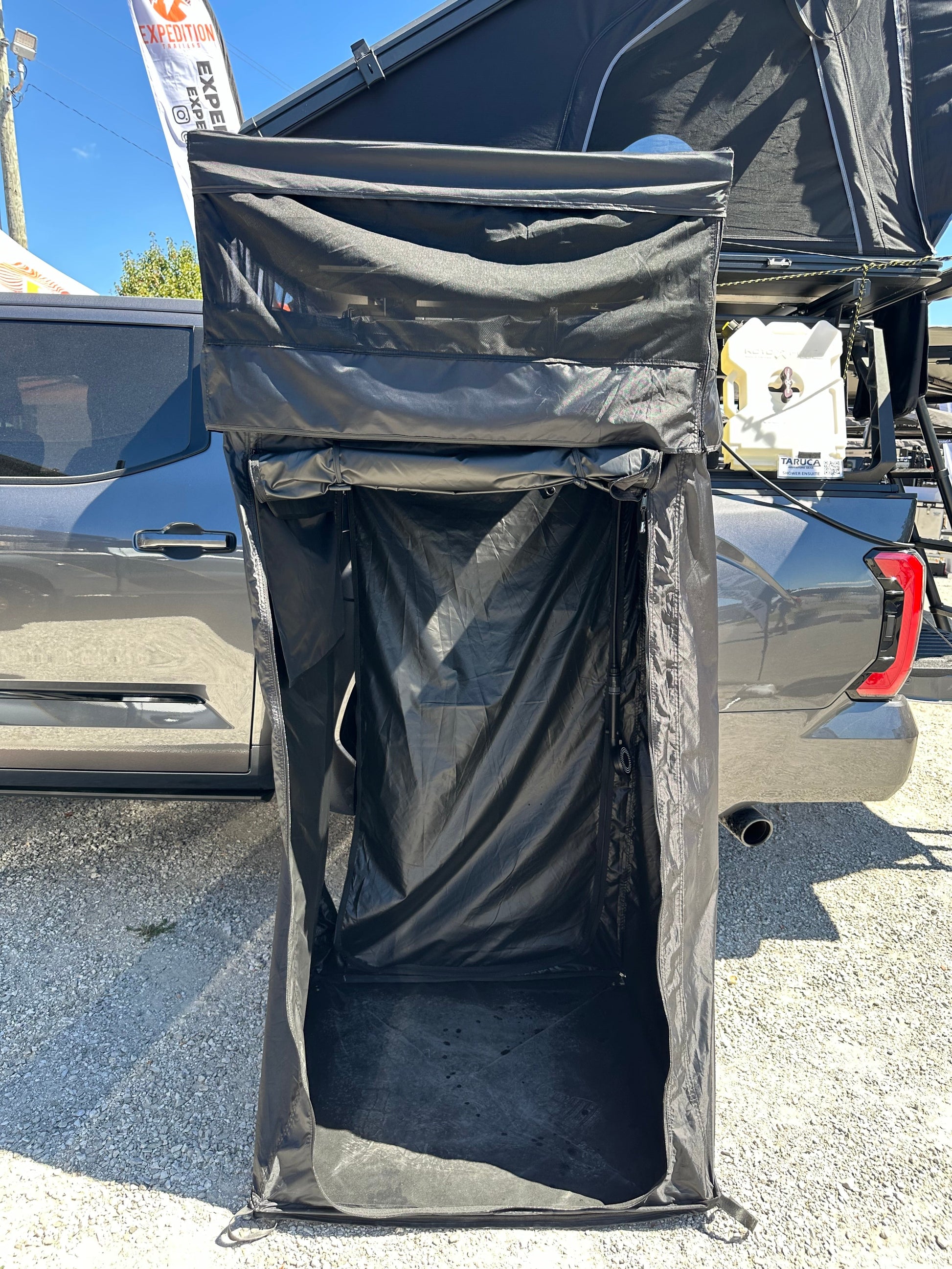 A quick setup awning that can be used as a change room, privacy area, and shower.