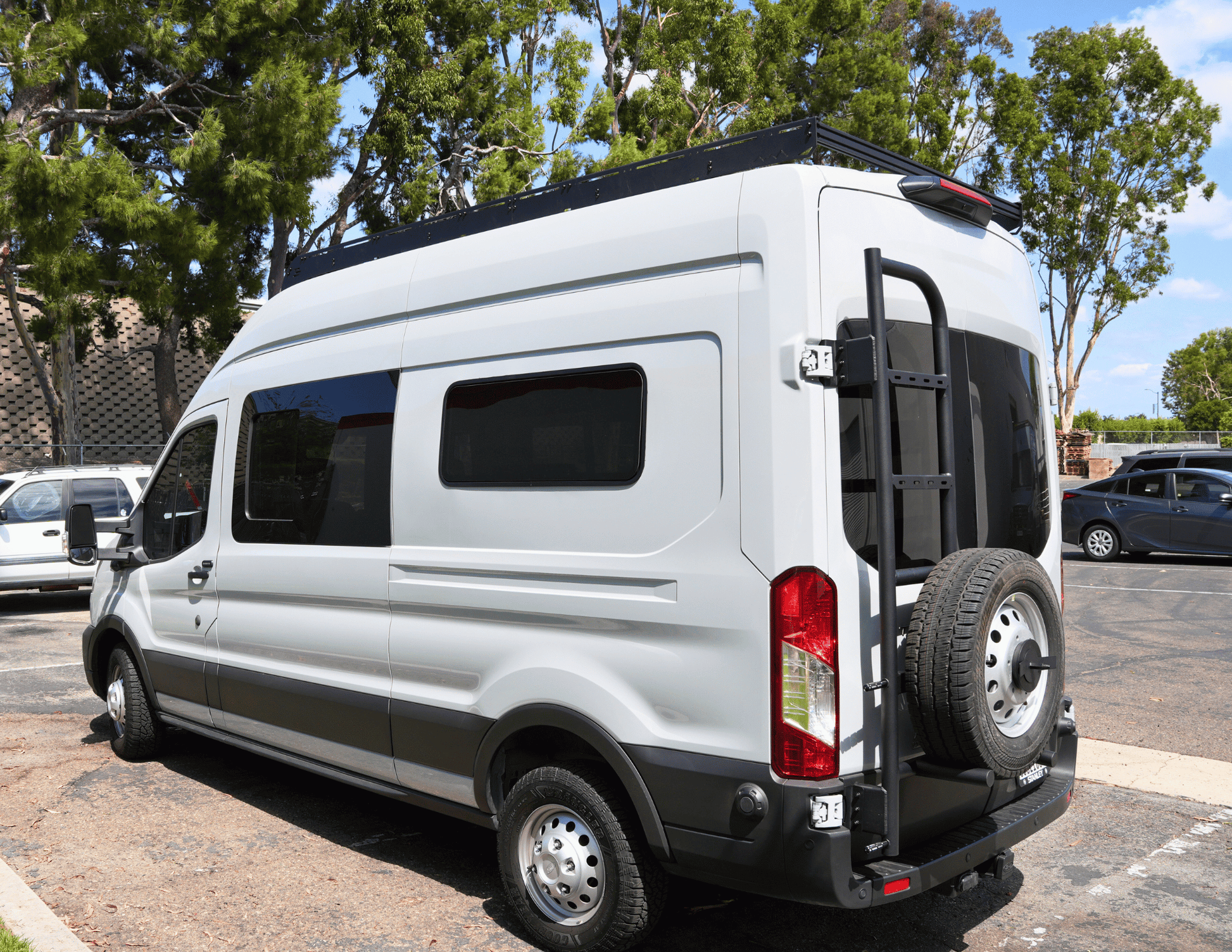 Upgrade your adventure rig with the White Top Adventures Transit Rear Tire Carrier Ladder—a purpose-designed solution that brings storage, utility, and rugged style to your van-life build. Whether you’re storing a full-sized spare, mounting a recovery board, or simply want quick roof-rack access, this ladder is built to keep up.
